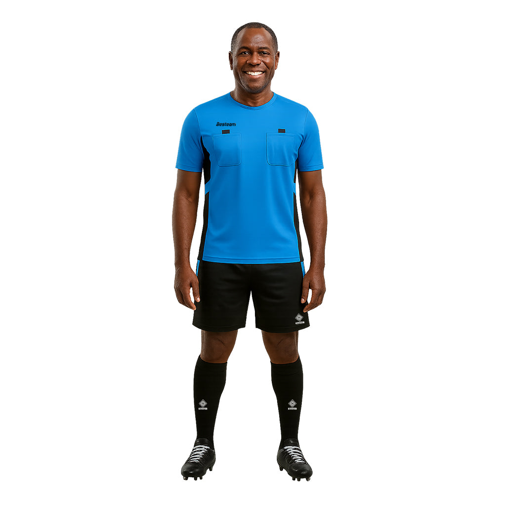 Besteam referee kit is designed with functionality and comfort in mind. Crafted from a lightweight, quick-drying fabric, it keeps referees cool and dry during intense matches. Mesh inserts on the jerseys and shorts maintain optimal body temperature. For wearer comfort, a ribbed round neck collar is incorporated. The jersey features two Velcro pockets on the front, while the shorts offer two side pockets and one Velcro pocket at the back. Cord tie shorts provide adjustability for a secure fit, and each kit includes a pair of Besteam socks for a complete and practical officiating outfit.